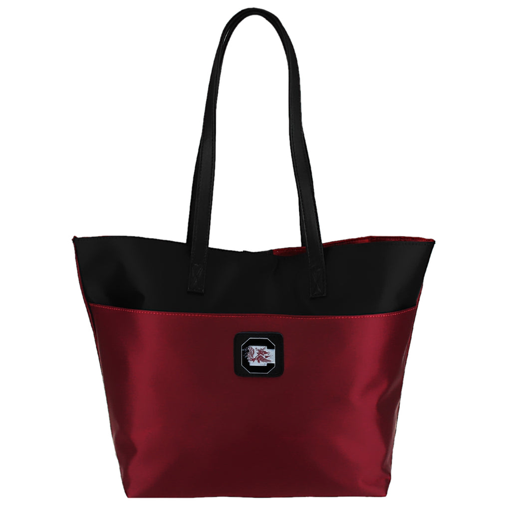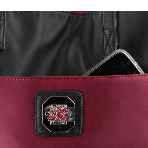 A must for any South Carolina Gamecocks Fan! This Iconic style tote is timeless! This spacious and durable mid-sized tote displays the logo as a raised solid metal piece finished with black enamel. Designed with a two toned nylon material, faux leather straps and magnetic clasp closures at the top and exterior pocket. Fits laptops, books, wallets and lunch! Use it for school, work or everyday.